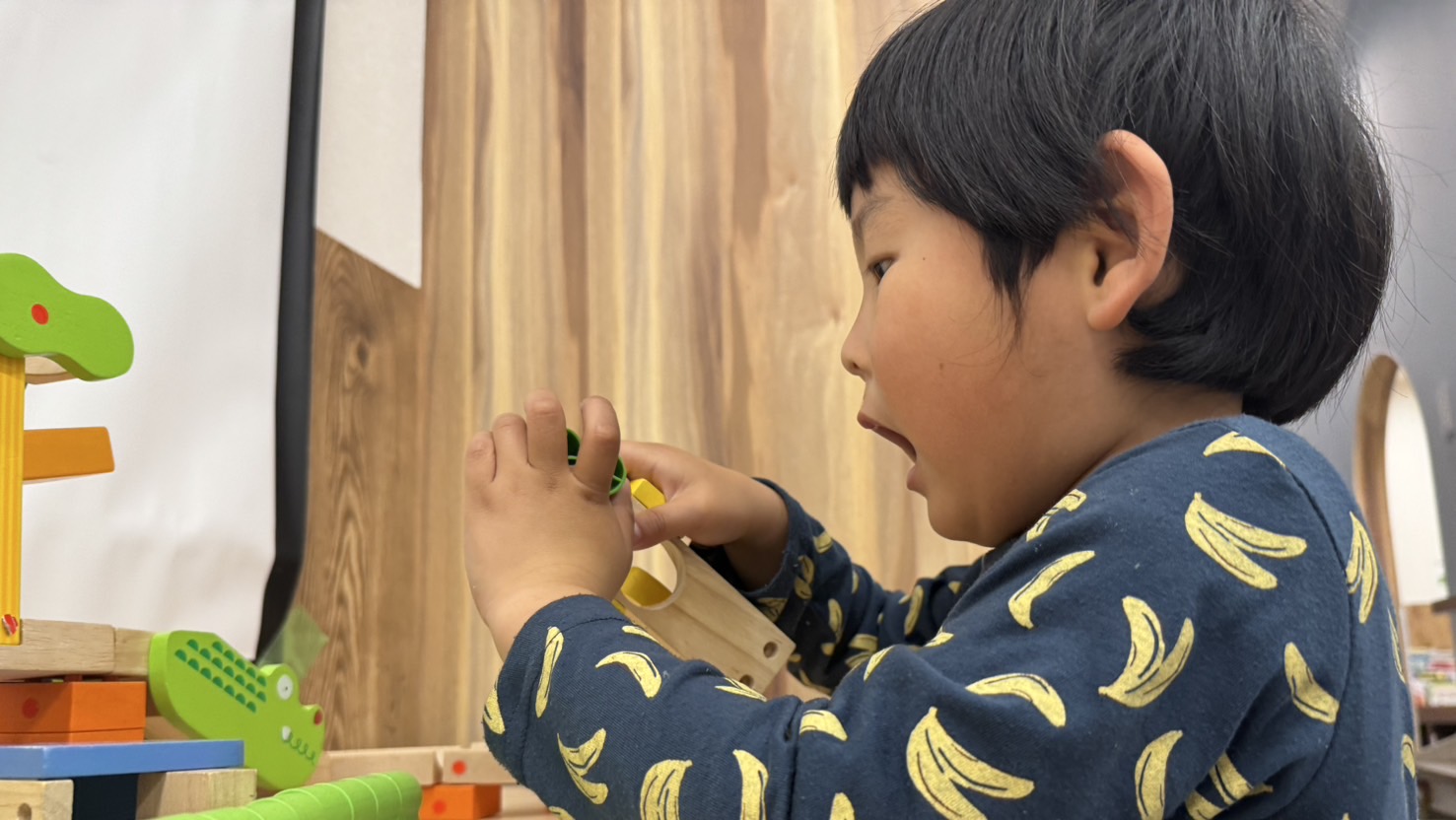 レールの向きや高さを工夫しながらコース作りを楽しみ、完成後は何度もボールを転がして夢中に遊んでいました。