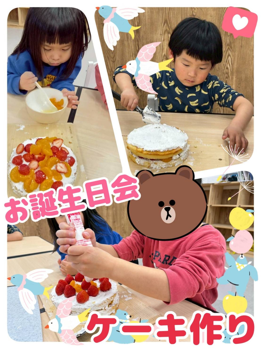 毎月恒例のお誕生日会のケーキ作りですが、春先は苺を使えるので豪華で嬉しいですね☺️🍓