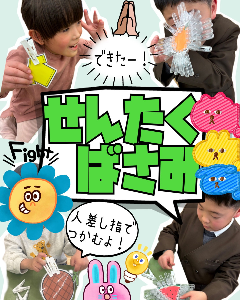 運筆やスプーン、お箸の練習を始めた子どもたちの準備運動として洗濯ばさみを使った指の運動を行っています🤏