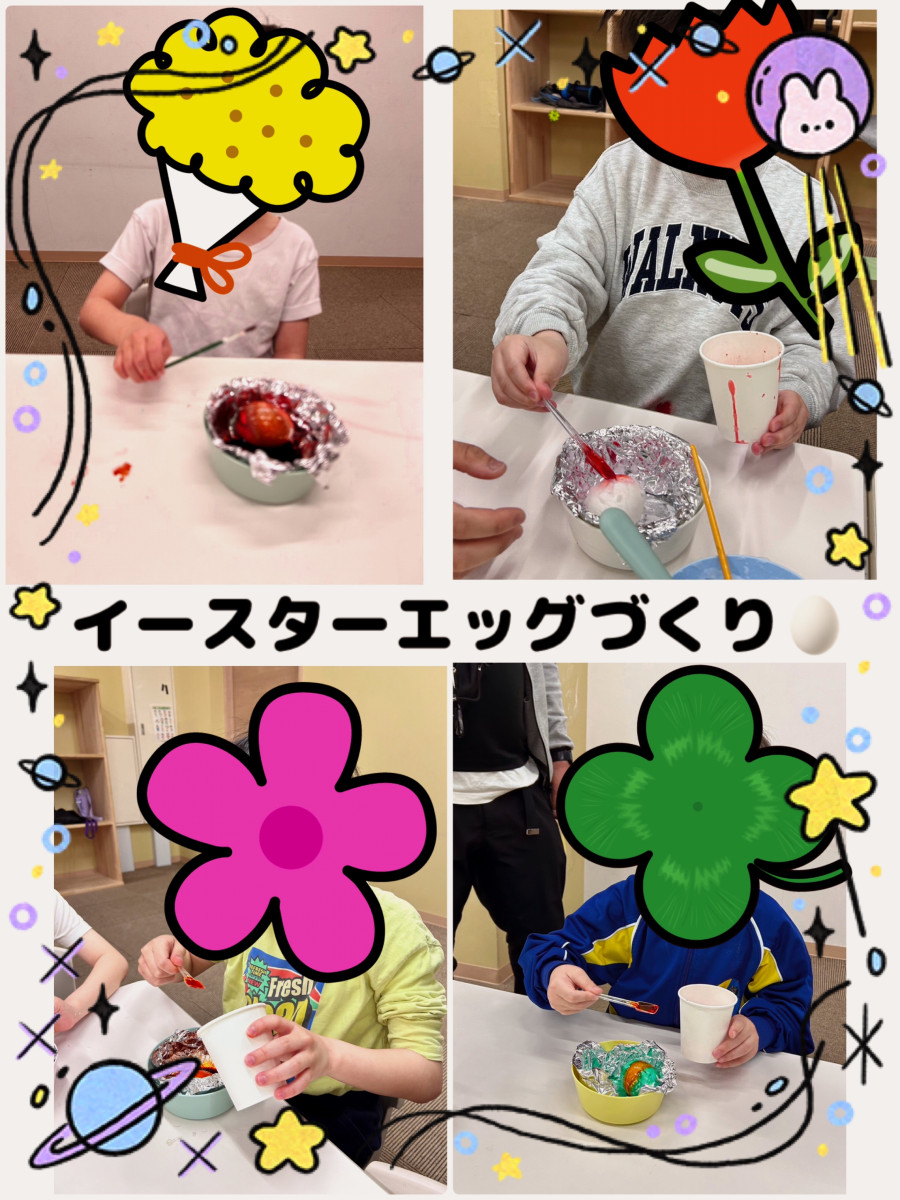 たまごに自分の好きな色をつけて、 オリジナルのイースターエッグを新一年生の子たちも一生懸命取り 組んでいました。