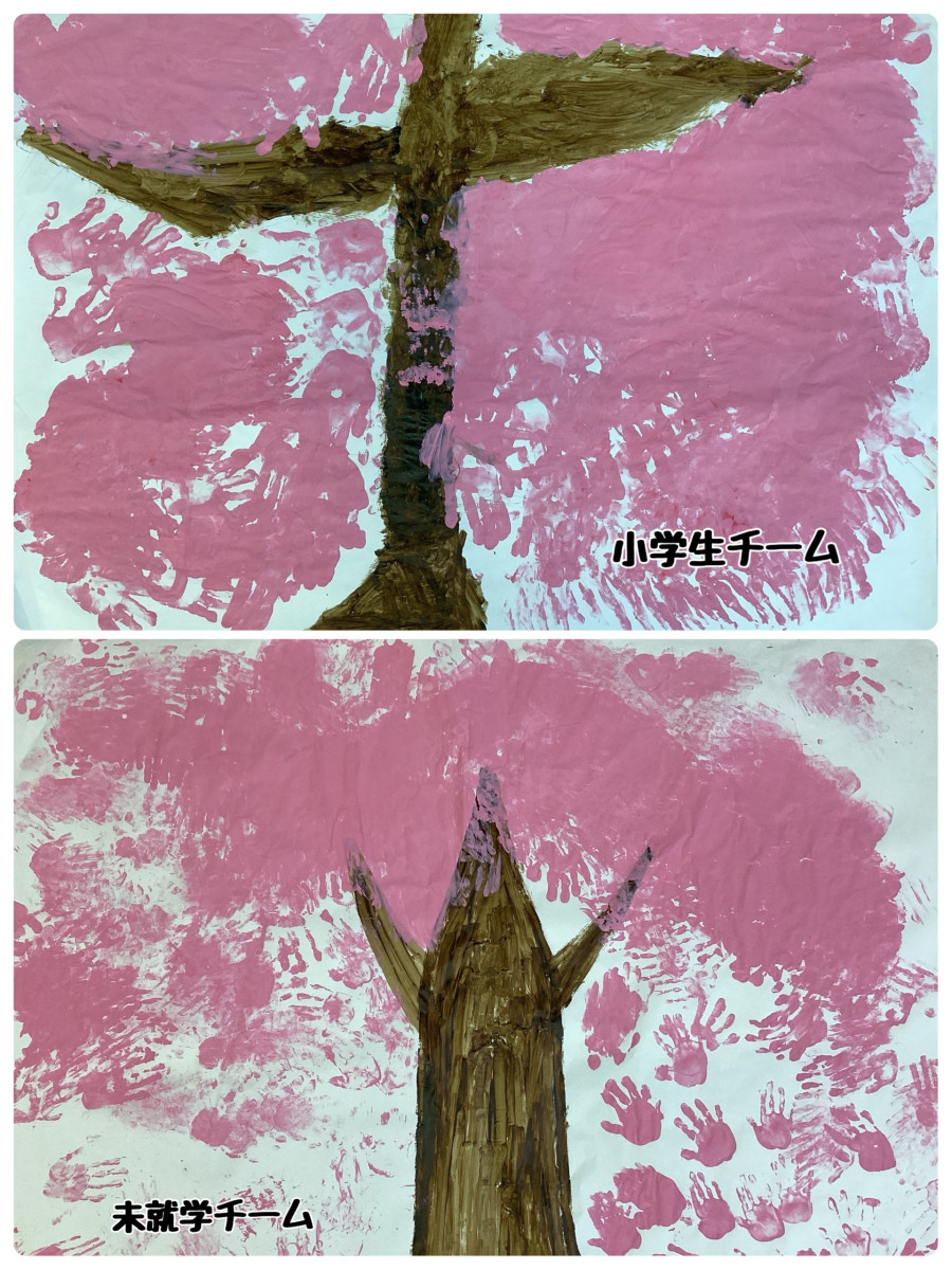 絵の具の感触が苦手な子、楽しい子それぞれでしたが、みんなで綺麗な桜の木を完成させることができました😊
